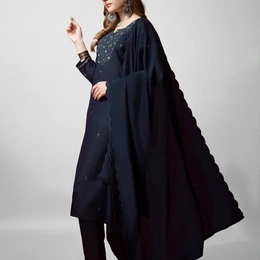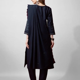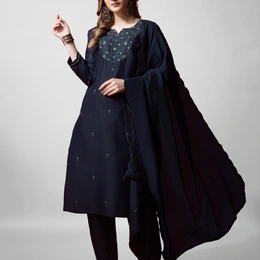 Look graceful and stylish with this Fully Stitched Cotton Blend Kurti Pant Dupatta Set. The kurti features elegant embroidery on a soft cotton blend fabric, paired with a comfortable matching pant. Completing the outfit is a silk blend dupatta with an embroidered border, adding a rich traditional touch. The deep navy blue color makes it a versatile outfit, perfect for festive occasions, parties, or casual gatherings.