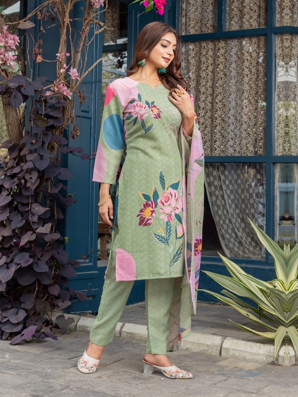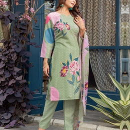 Stay comfortable and stylish with this Fully Stitched Cotton Blend Kurti Pant Dupatta Set. Made from breathable cotton blend printed fabric, the kurti and pant are designed for ease of wear, while the matching printed dupatta completes the look with elegance. The subtle mahendi shade makes this set a versatile choice for office wear, casual outings, and daily use.